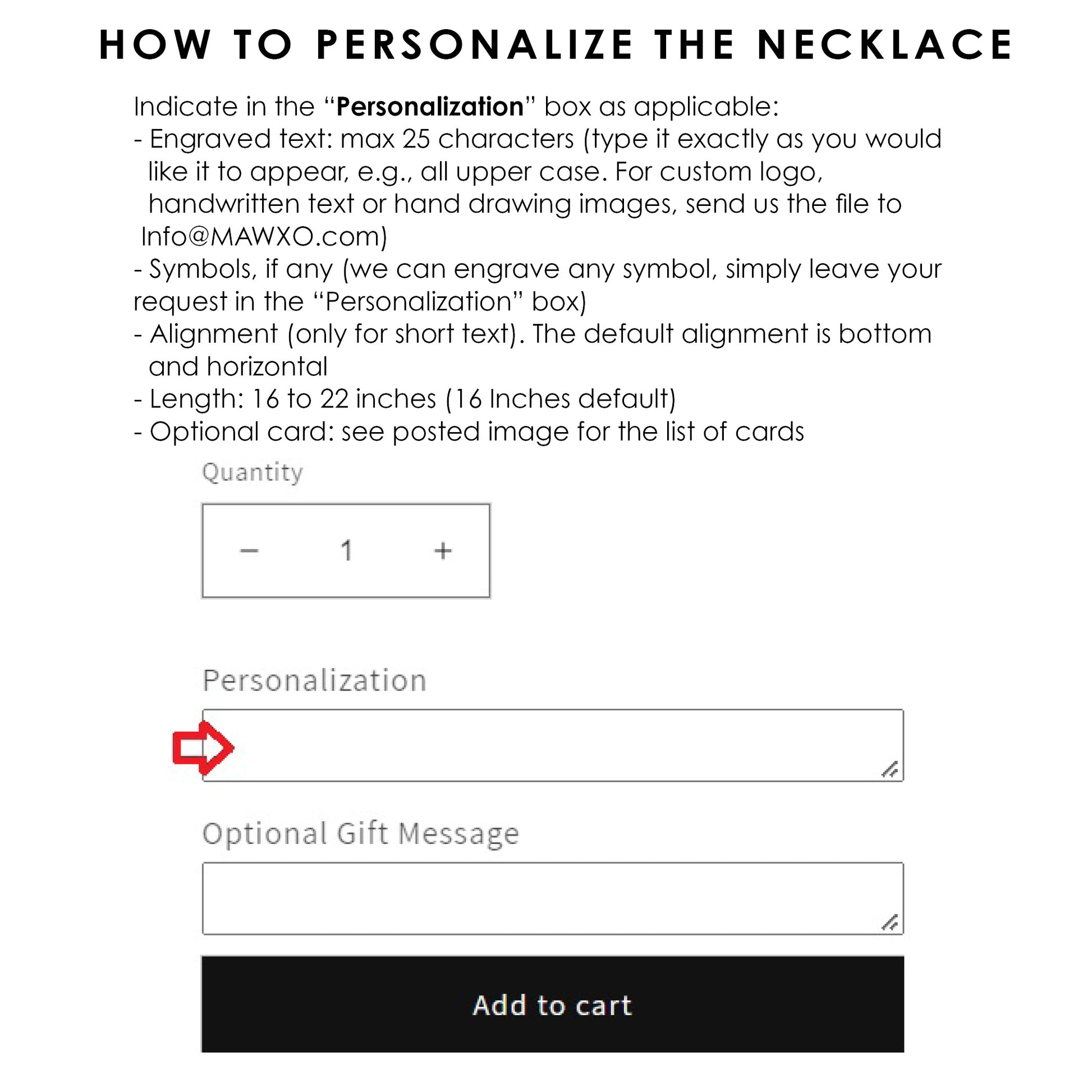 - Engraved text: max 25 characters (type it exactly as you would like it to appear). For custom files, send the file to Info@MAWXO.com